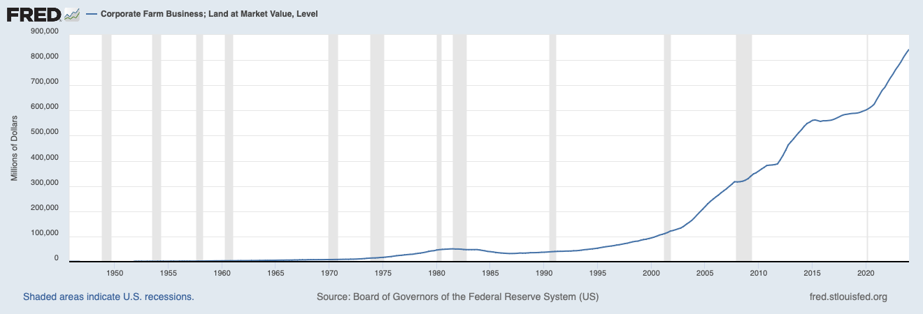 Land at Market Value. Board of Governors of the Federal Reserve System (US), Corporate Farm Business; Land at Market Value, Level [BOGZ1FL185010005Q], retrieved from FRED, Federal Reserve Bank of St. Louis; https://fred.stlouisfed.org/series/BOGZ1FL185010005Q, August 6, 2024.